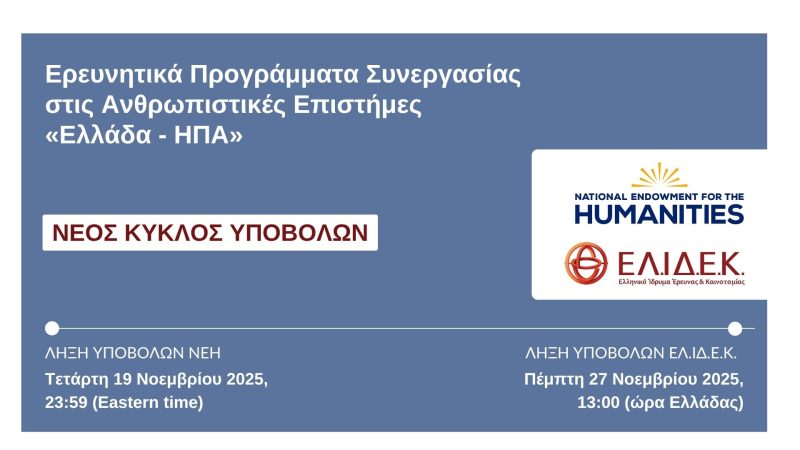 15 Οκτ ΕΛΙΔΕΚ – ΔΕΛΤΙΟ ΤΥΠΟΥ: Β’ Περίοδος Υποβολής Προτάσεων- Ερευνητικά Προγράμματα Συνεργασίας στις Ανθρωπιστικές Επιστήμες ‘‘Ελλάδα – ΗΠΑ”
