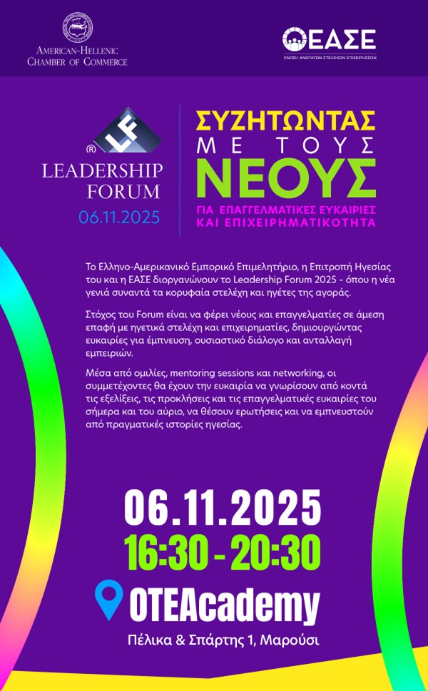 H εκδήλωση LEADERSHIP FORUM: “ΣΥΖΗΤΩΝΤΑΣ ΜΕ ΤΟΥΣ ΝΕΟΥΣ ΓΙΑ ΕΠΑΓΓΕΛΜΑΤΙΚΕΣ ΕΥΚΑΙΡΙΕΣ KAI ΕΠΙΧΕΙΡΗΜΑΤΙΚΟΤΗΤΑ”, θα πραγματοποιηθεί την Πέμπτη 6 Νοεμβρίου 2025, ώρα 16.30, στο OTEAcademy, (Πέλικα & Σπάρτης 1, 15122, Μαρούσι Αττικής). Η εκδήλωση απευθύνεται σε νέους ηλικίας από 17–28 ετών, δηλαδή μαθητές γ’Λυκείου, φοιτητές και νέους εργαζόμενους.