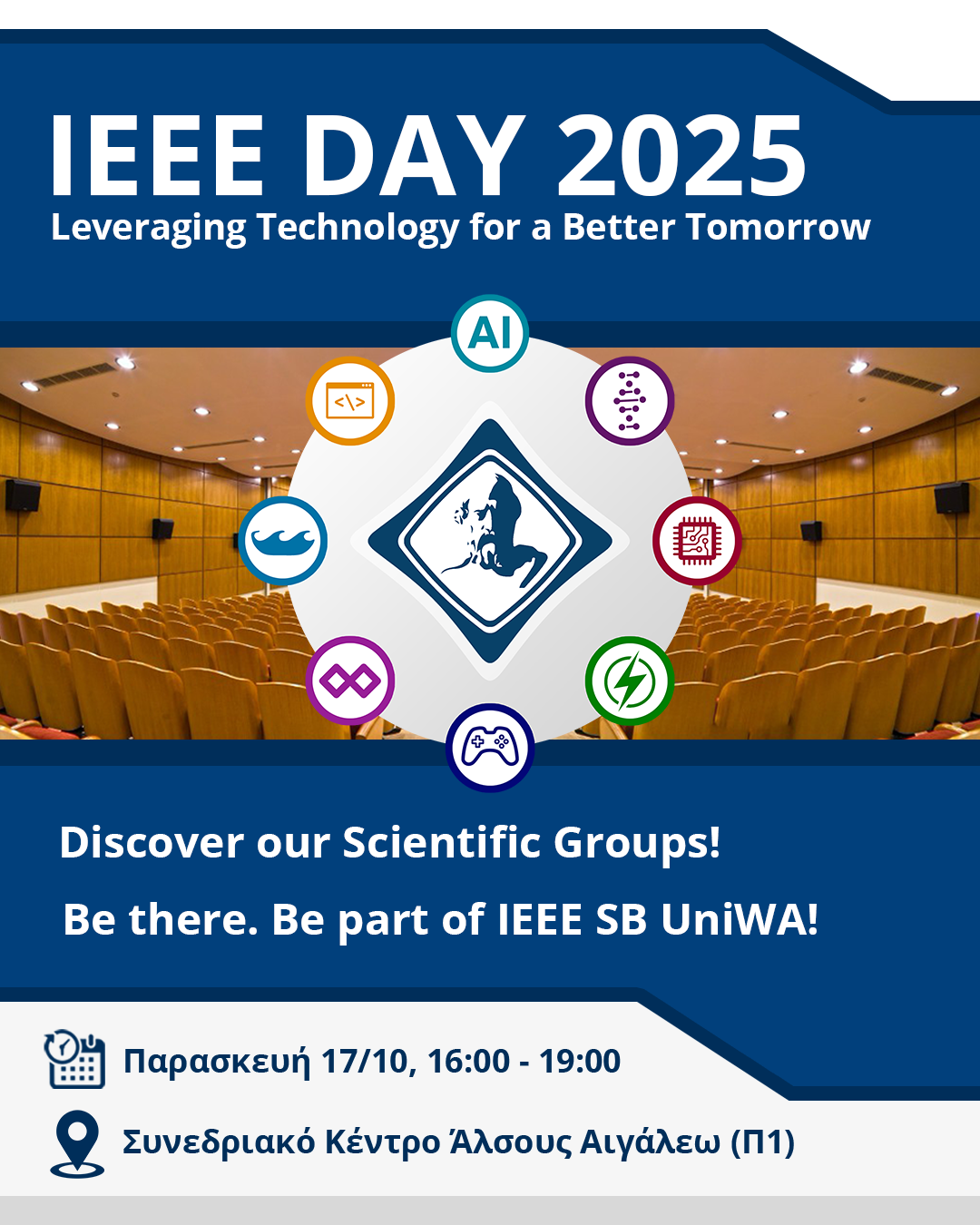 Αγαπητοί φοιτητές και μέλη της ακαδημαϊκής κοινότητας, Το επίσημο φοιτητικό παράρτημα του IEEE στο Πανεπιστήμιο Δυτικής Αττικής (IEEE SB UniWA) σας προσκαλεί στο IEEE Day 2025, την Παρασκευή 17 Οκτωβρίου, 16:00–19:00, στο Συνεδριακό Κέντρο Άλσους Αιγάλεω (Π1). Το IEEE (Institute of Electrical and Electronics Engineers) είναι ο...